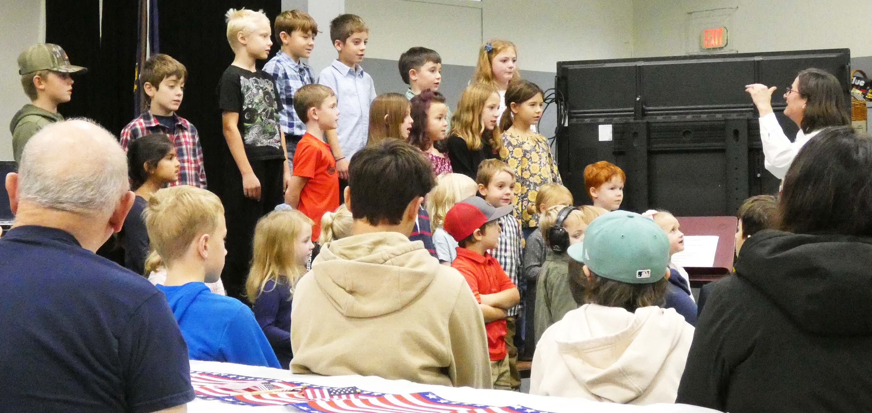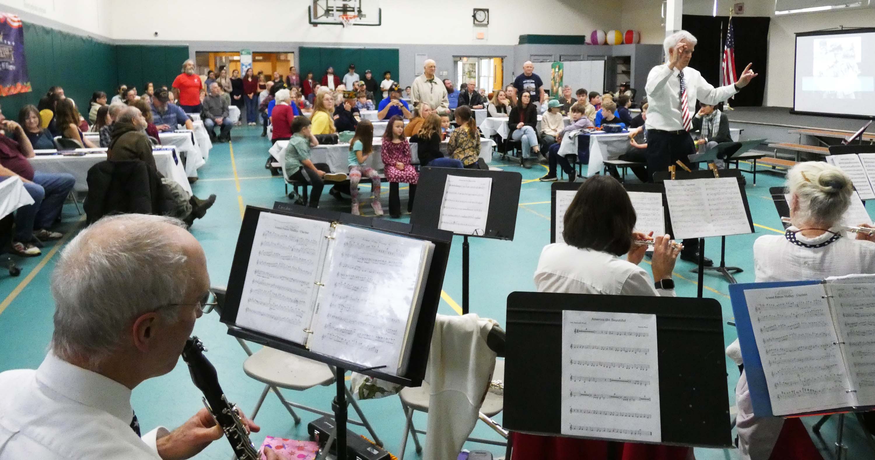 Students, veterans, and visitors had a double treat: not only did they hear great music to accompany some of America's most patriotic lyrical songs, but the young students were also led in many songs by their music teacher, Nancy Wilson, who is also a member of the band.