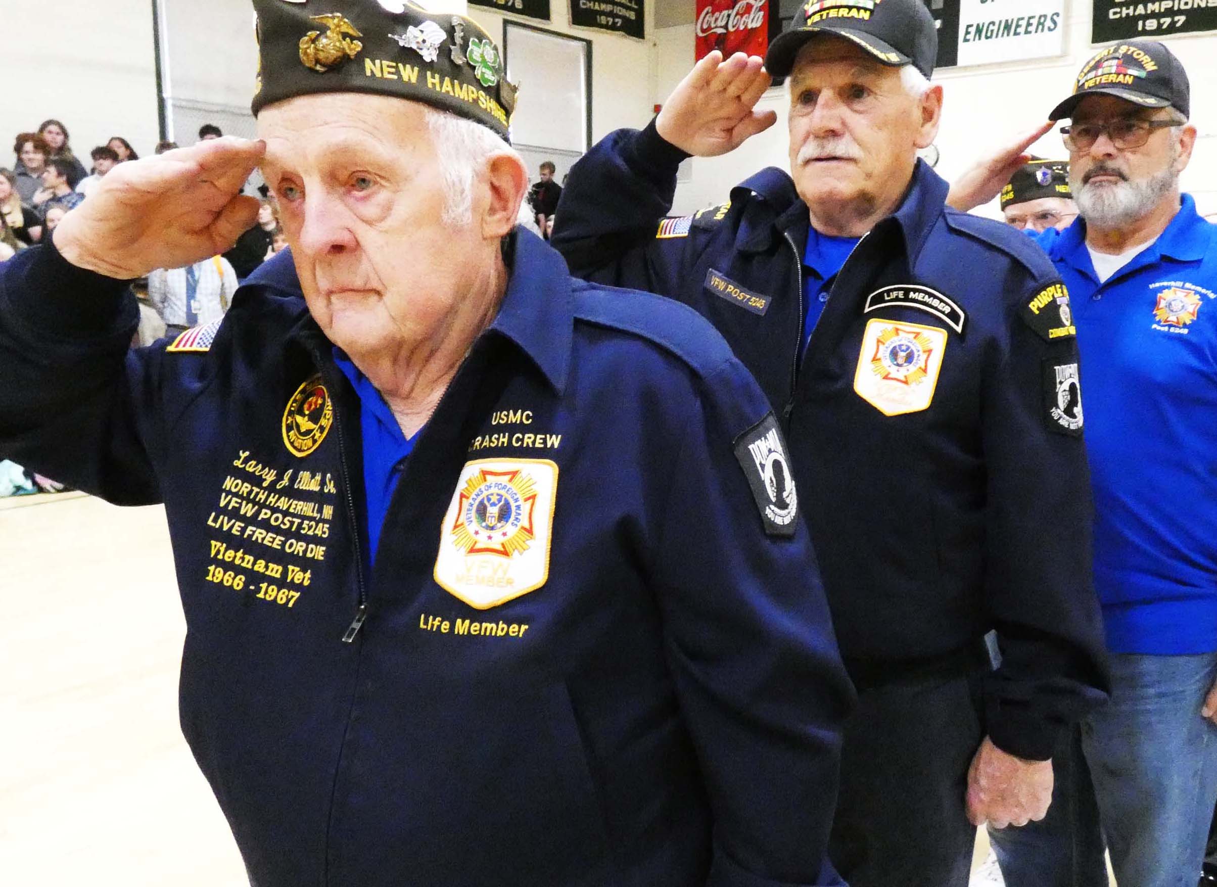 Monday morning, November 10, broke cold and clear, with the sounds of young voices and an American Legion ceremonial color guard standing at attention to accompany the Haverhill Cooperative Middle School student body as they held their annual Veterans Day program beginning at 8:30 AM.