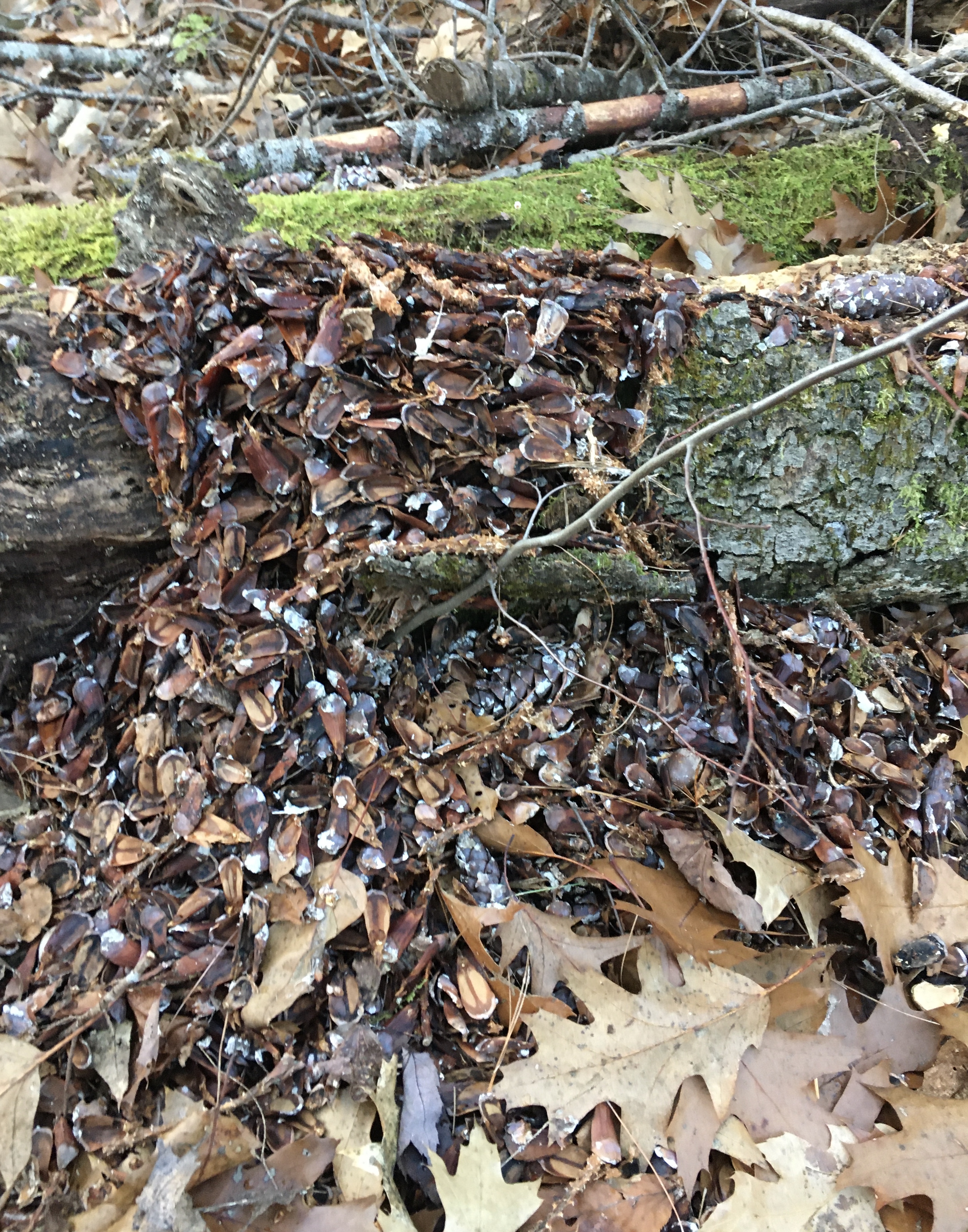 Not far from our house I found red squirrels preparing for winter, first gathering and piling a large number of white pine cones and a few days later tearing them apart to remove the seeds as the attached photos show.
