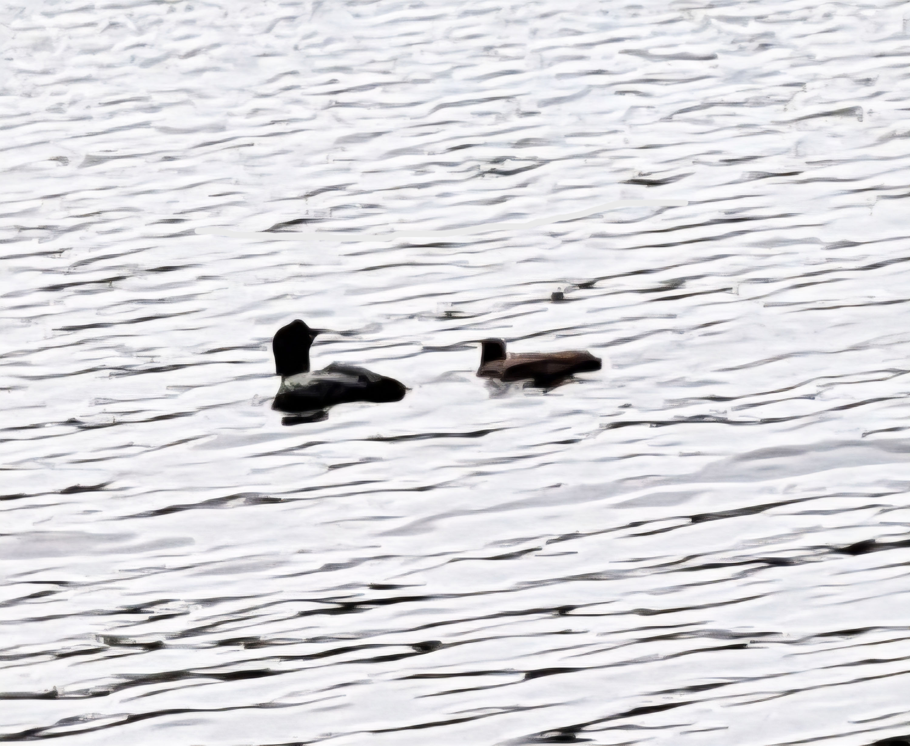 In the past, we had seen the loons out towards the center mass of the lake, but today they were cautious to stay close to that rocky shore, and it was no coincidence that they did so. Looked to us like some personal protection was going on there, and as we glanced around, a pair of large male and female bald eagles were watching from the branches of a nearby 100-foot white pine. Yikes. Twin dangers above, and the loons knew it and were not venturing out too far.