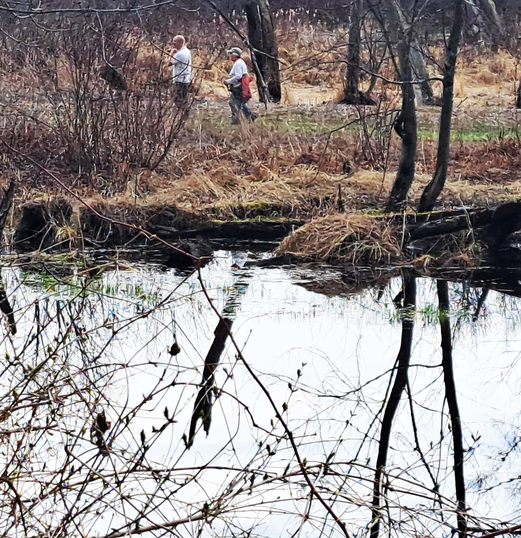 Beaver huts and their occupants were busy. Young swamp saplings are continually being chewed down and silently being ferried away to become part of the Beaver’s World at Bedell. I have not yet heard a spring peeper in Piermont, but at Bedell, they are chirping, whistling and peeping throughout the area.