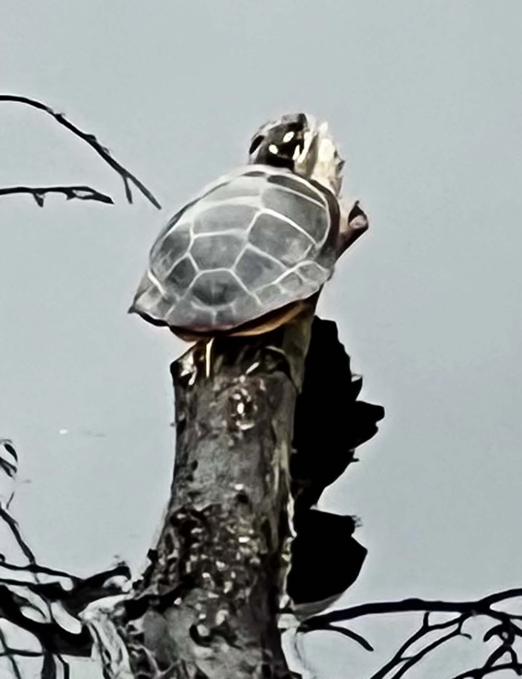 The turtle guy counted 12 turtles he had seen flopping into the water, swimming or sunning themselves on branches sticking out of the water. Some branches had three turtles, enjoying the day. Those who were human-shy jumped from their perch into the water and headed for the bottom, others, who had seen humans walk around and were used to them remained, basking on the limb offering visitors a chance to enjoy looking at their interesting shapes, shells and dozing faces. Snappers were there, too, big ones, been there for years and acted like they owned the place.