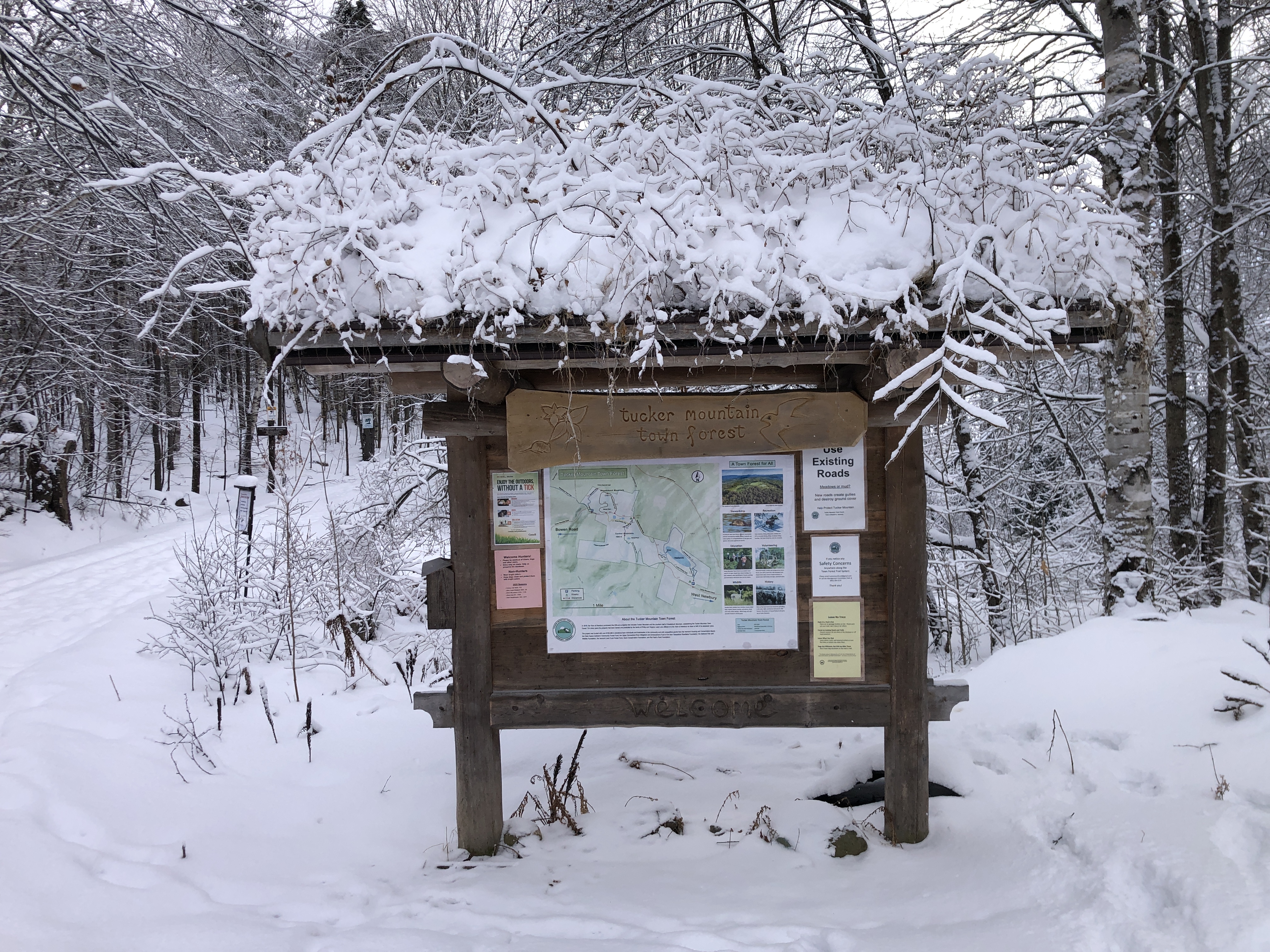 Caption: Ice on the bushes on the roof of the kiosk located on the Tucker Mountain Road is indicative of what we soon encountered on the Putnam Trail