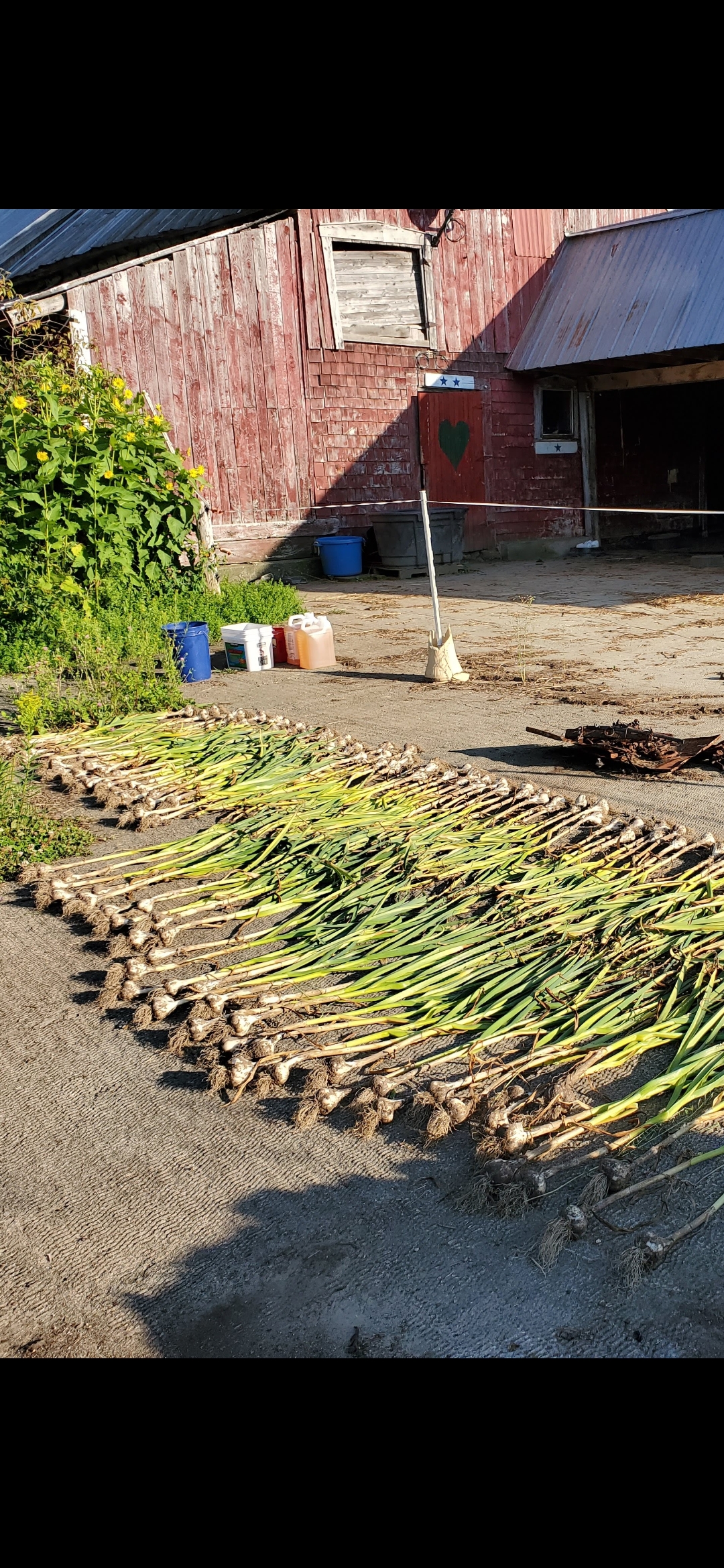 My garlic has been hanging in the barn since early August, where it will stay for a month or more. When the tops are thoroughly dried out and the leaves are crunchy, I'll take them down and cut the tops and roots off. I look for the heads with the biggest cloves and break them apart, saving the biggest cloves to replant for next years crop. The rest will be put in wicker baskets with newspaper covering them for long term storage.