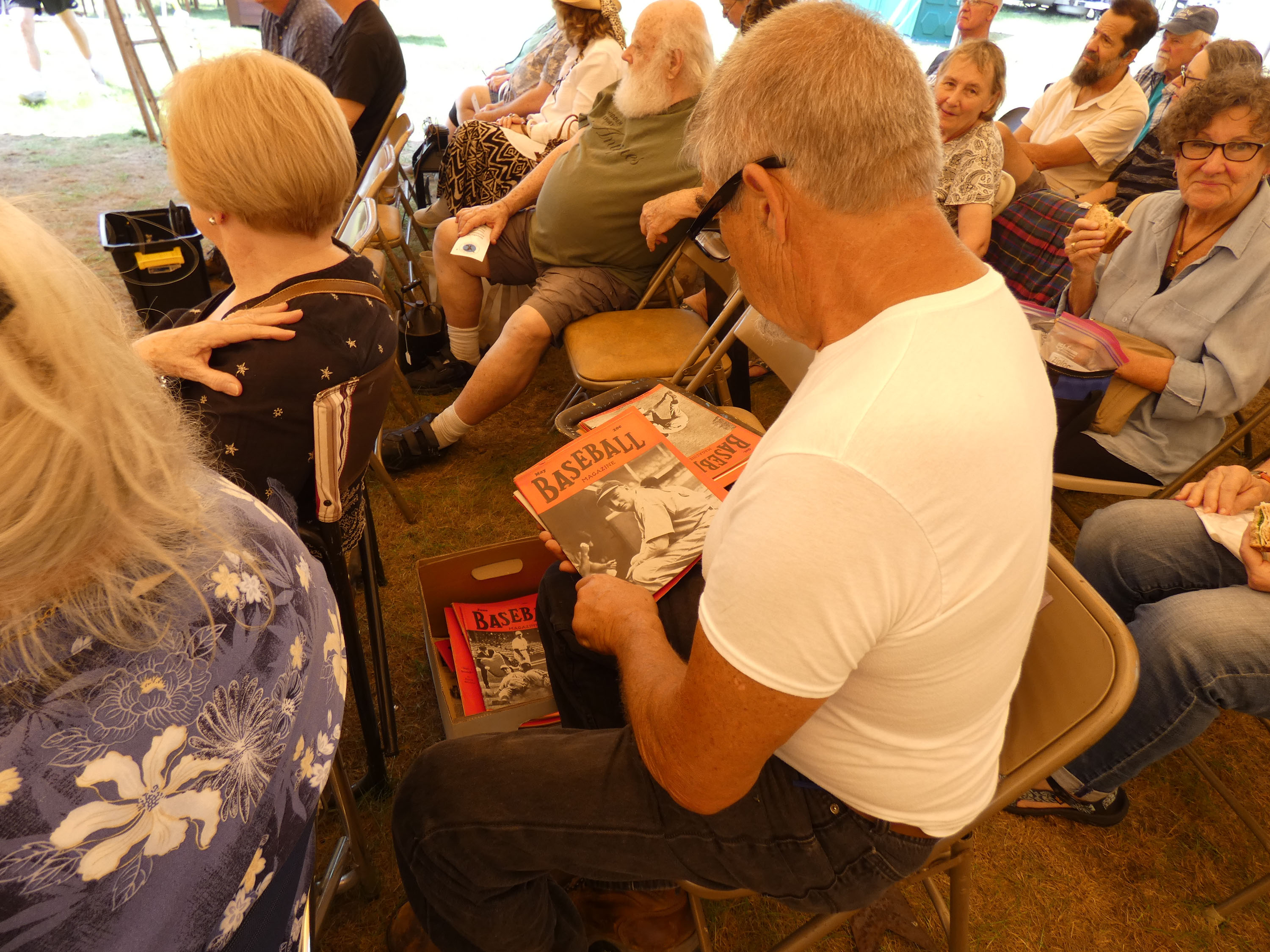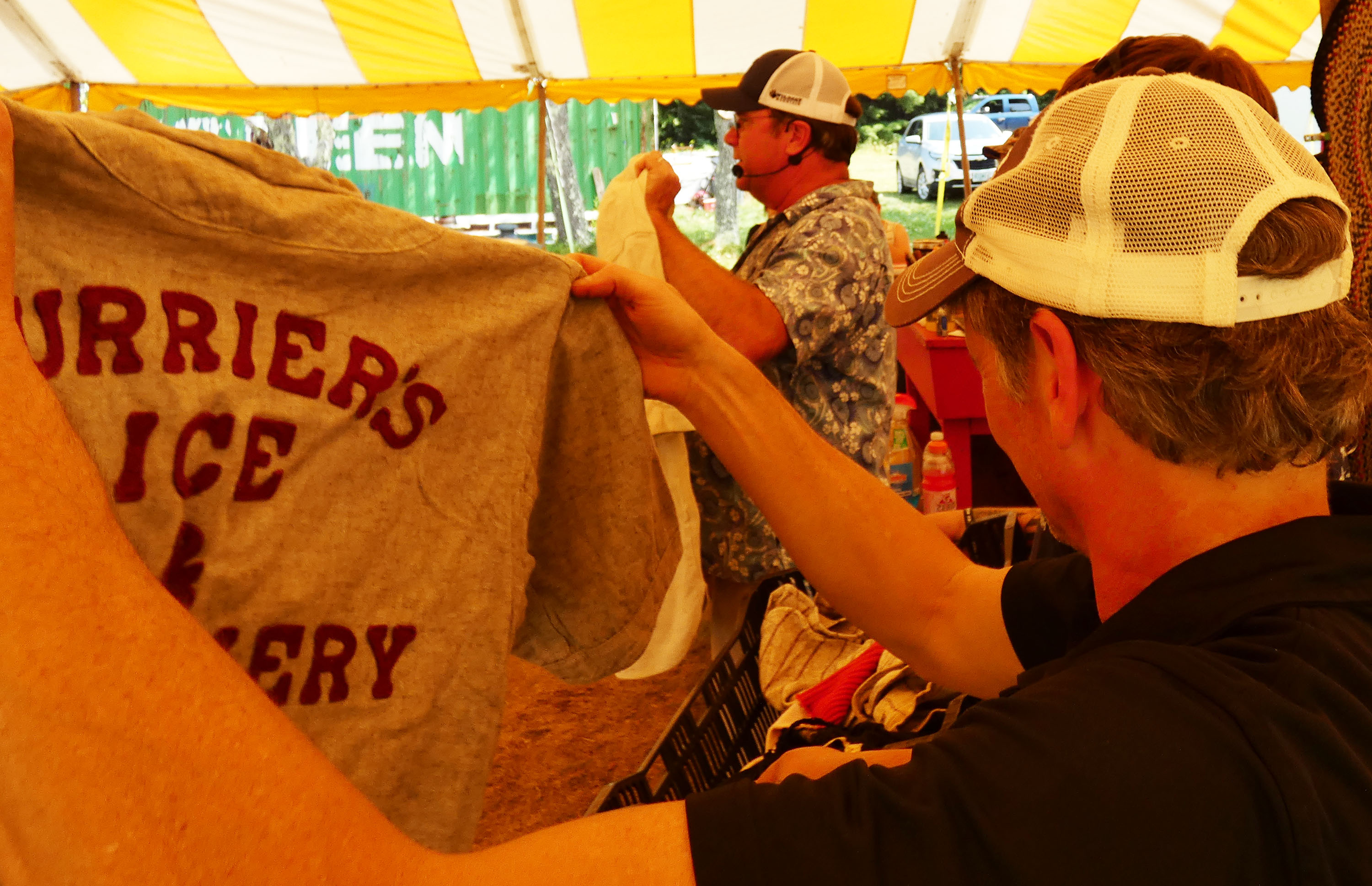 There were many different lots brought up for bidding, such as a collection of postcards in a handsome commercial seed box, some of John’s old wool town baseball uniforms from Fairlee and Piermont that were embroidered with sponsors’ names on the back, such as “Currier’s Machinery and Ice.”