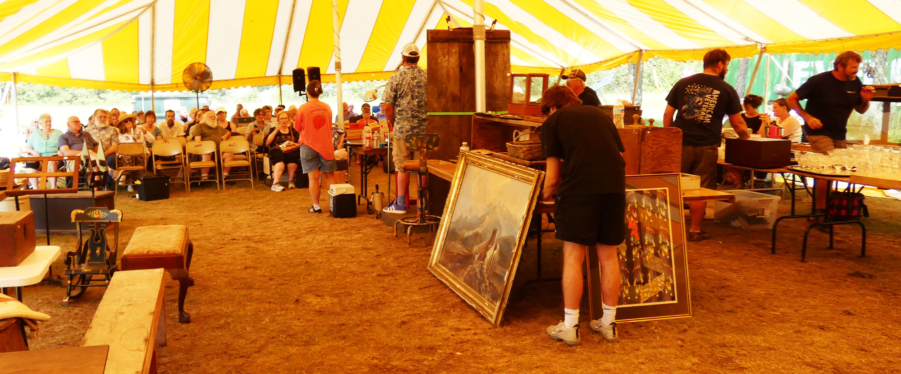 The weather was quite hot. However, while I was there, Josh Steenburgh managed to move a significant number of items in a short amount of time. He, the staff, and other Steenburgh family members handled the chore of presenting and auctioning items.