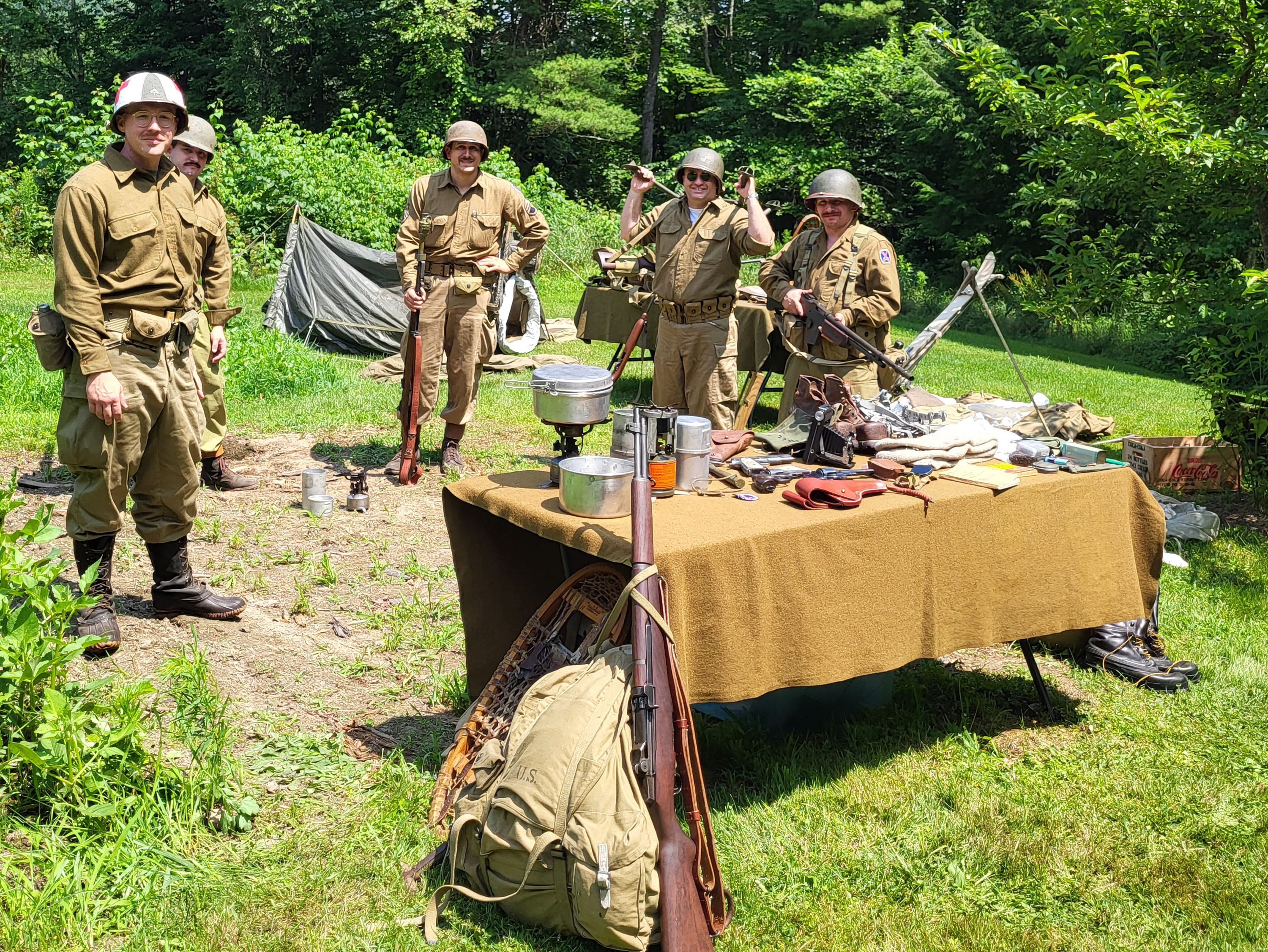 Assembled on a part of the property at the entrance of the Memorial site in Landaff, former 10th Mountain Division soldiers who have all been deployed during the War on Terror, assembled a WW2 encampment with authentic M1 Garand military rifles and other equipment including tents, cold weather gear and other field gear such as that used during WW2 combat including a rucksack and snowshoes. In addition to that, they held a question-and-answer period and answered many questions about the equipment.