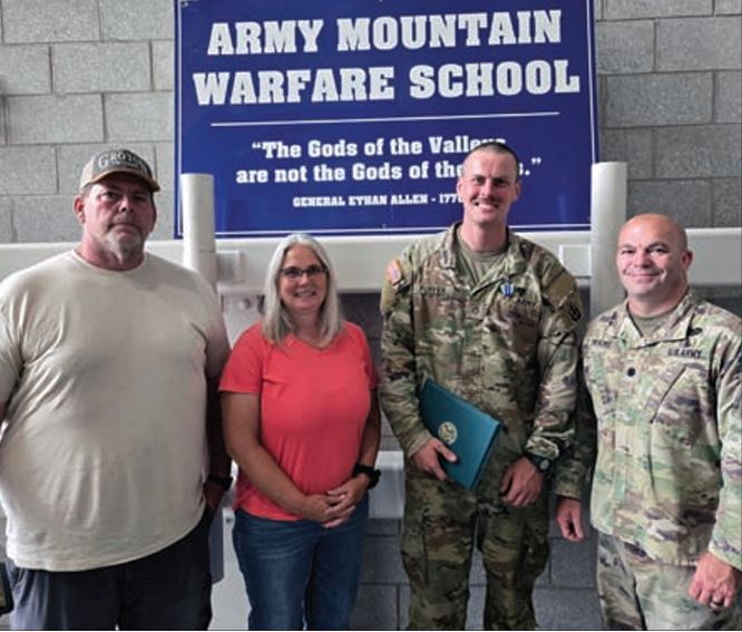 PFC Puffer was also awarded the Army Achievement Medal at the graduation ceremony. Pictured are Mark’s parents Matthew and Tracy Puffer of Groton and to the right is Lieutenant Colonel Jason Beams, commander of the Army Mountain Warfare School. Matt Puffer and LTC Beams both formerly served at Alpha Co. in Bradford as ‘Tankers’ when Alpha Co. was an Armor unit.