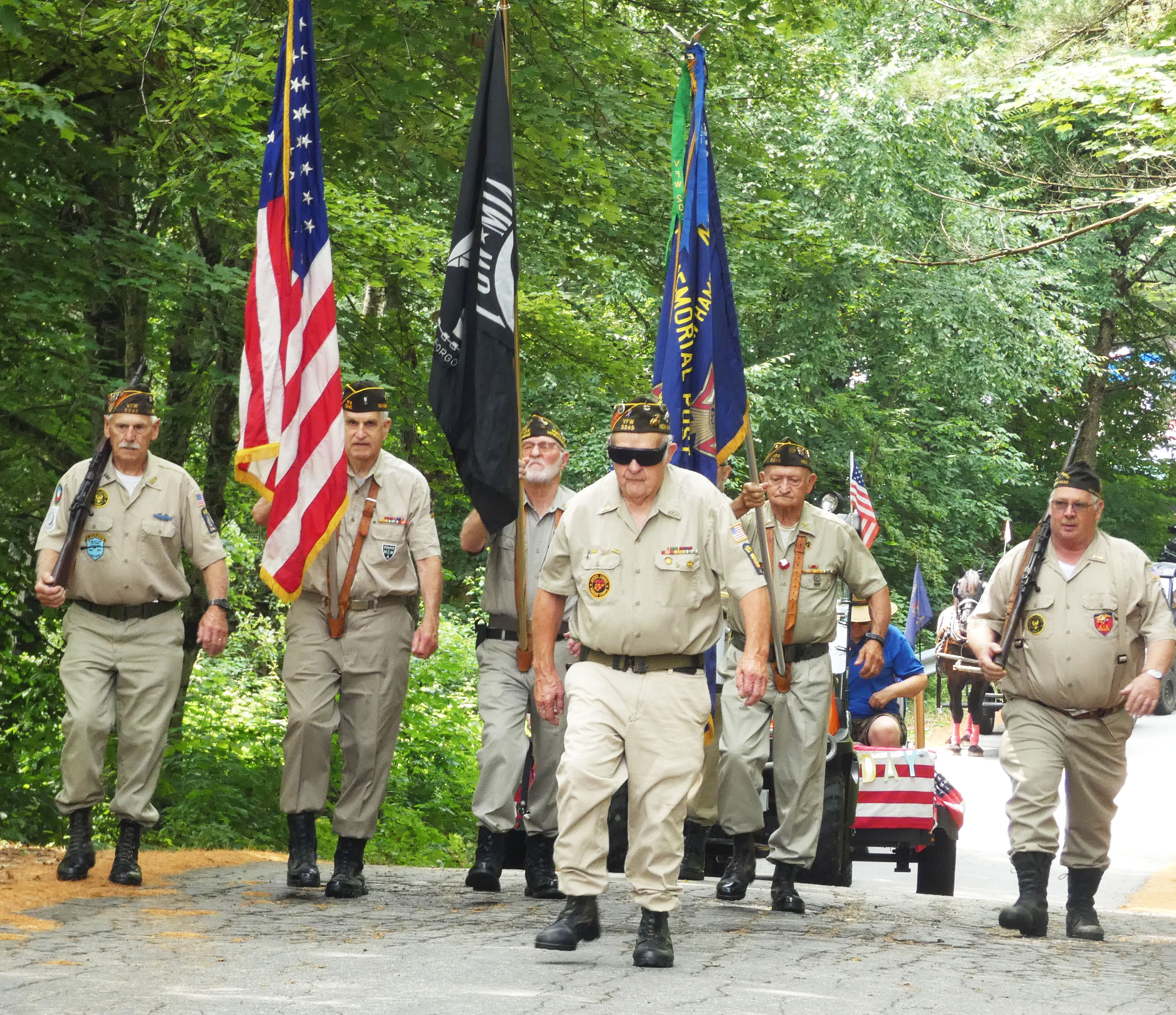 With the Veterans of Foreign Wars Post 5245 of North Haverhill leading the parade, Commander Larry Elliott leads his color guard down Route 25 towards a large crowd gathered in Warren Village to watch the Annual Old Home Day Parade.